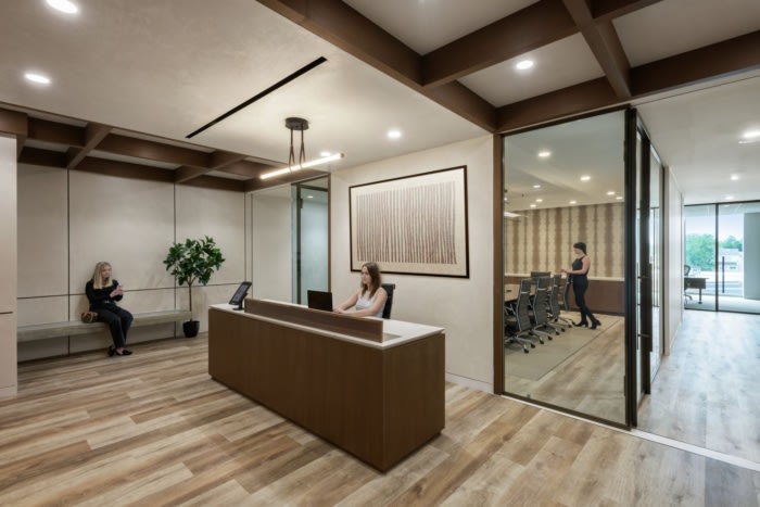 Through an in-depth culture card programming exercise, we learned that ORG is warm, inviting, and distinct from competitors. These qualities informed every design decision, from strategically placed conference rooms and an expanded breakroom with versatile meeting areas, to increased privacy in the open work area. The reception area features carefully coordinated coffers and reveals, setting the tone for the space. Behind it, a hidden lounge—accessed through a concealed door—offers partners a place to retreat and unwind. Known as the whiskey room, this intimate space includes a mounted deer head belonging to one of the company’s late founders, serving as both a tribute and a gathering spot for end-of-day conversations with colleagues or clients.