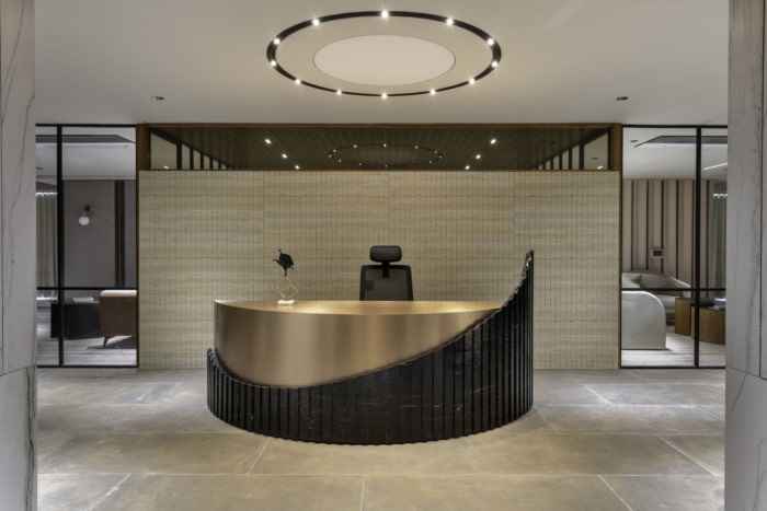 One of the key highlights of the project is the reception table, a sculptural element inspired by the undulating rhythm of market graphs. Crafted in fluted granite, it is both functional and emblematic—a physical manifestation of the company’s core identity. This approach to abstraction continues throughout the interiors, where subtle cues from bar charts, graphs, and data connections are interpreted through textures, joinery details, and surface treatments.