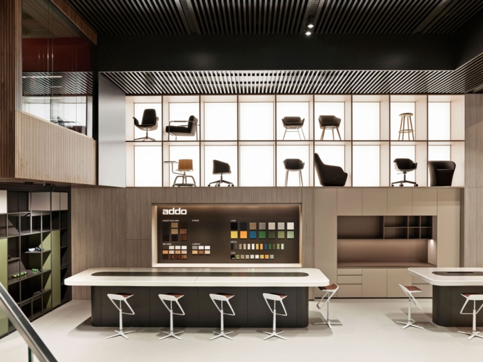 Beyond this, the office features an experience-focused showcase designed in bold red and turquoise tones. ADDO’s product range is presented here in an experience wall format, where illuminated display units, spotlights, and carefully selected backdrops transform the space into a storytelling space that immerses visitors in the brand’s heritage, values, and innovations.