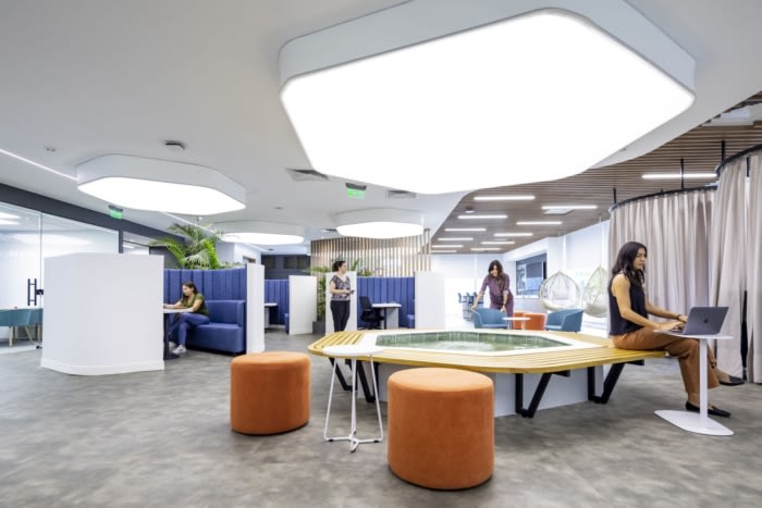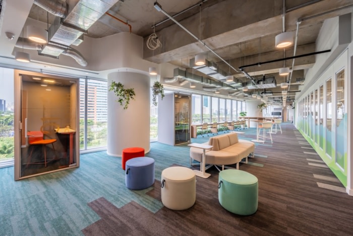 Its Informov’s Iron Mountain offices in São Paulo seamlessly blend modern aesthetics with functionality, featuring a grandstand for employee interaction and panoramic views that enhance the vibrant workspace experience.