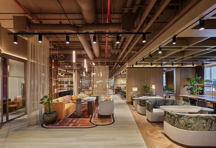 A-nrd’s Meadow Workspace in London harmoniously blends comfort and creativity, crafting a layered environment that fosters collaboration and focus within a vibrant, sensory-rich setting.