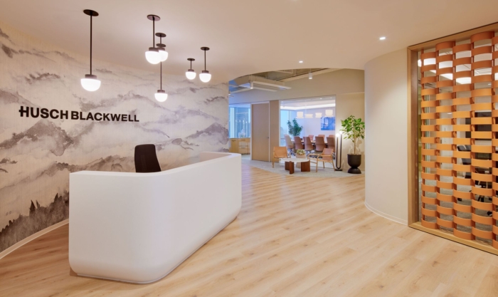 Partners by Design’s Husch Blackwell offices in Boston harmoniously blend modern design with the city’s historic waterfront, creating a reflective space that balances professional refinement and maritime inspiration.