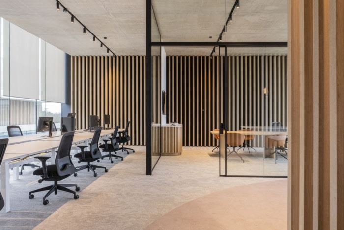 het Kantoor van Morgen designed the Van Hoorebeke Timber offices in Ghent, creating a dynamic, flexible work environment that harmonizes minimalism with functional comfort and engaging collaborative spaces.