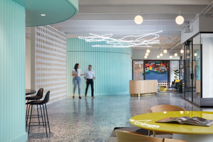 OTJ Architects designed a technology company’s offices in Miami, transforming a former ship repair warehouse into a vibrant, agile workspace that celebrates Miami’s Tropical Modernist heritage and Latin American influences.