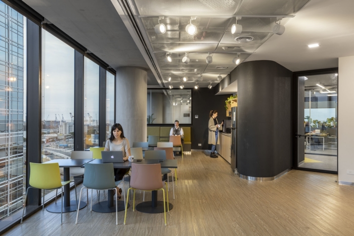 Save European Union (Unión Europea) Offices - Buenos Aires View Project Contract Workplaces Andrés Negroni Banquette Seating, Cement Floor, Chair, Column, Glass Walls, People, Recessed Downlight, Track / Directional, Wood Floor