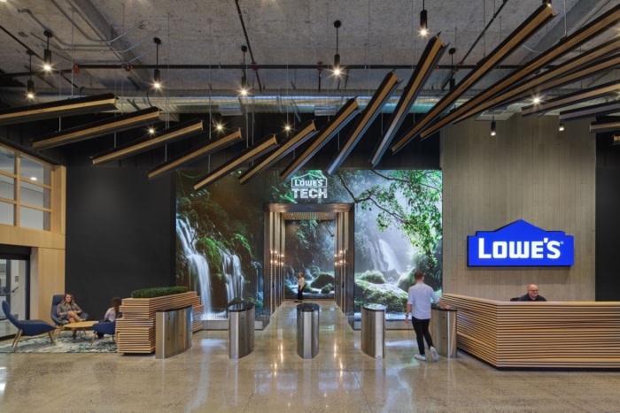Save Lowe’s Offices - Charlotte View Project Little Diversified Architectural Consulting Halkin Mason Photography Ginkgo Wire Table by Davis FurnitureSachet Lounge by Davis Furniture Acoustic Ceiling Baffle, Branding, Cement Floor, Coffee Table, Elevator Lobby, Exposed Duct, People, Reception / Waiting Area, Wall Graphics, Wood