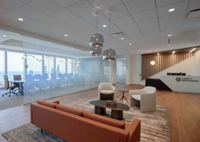 Save Cerity Partners Offices - Chicago View Project Partners by Design Ross Floyd Jackson Lounge by Bernhardt DesignRoo Occasional Tables by OFS Area Rug, Branding, Chair, Coffee Table, Drop Ceiling, Glass Graphics, Glass Walls, Lounge Chair, Occasional Table, Reception / Waiting Area, Sofas / Modular Lounge, Wood, Wood Floor