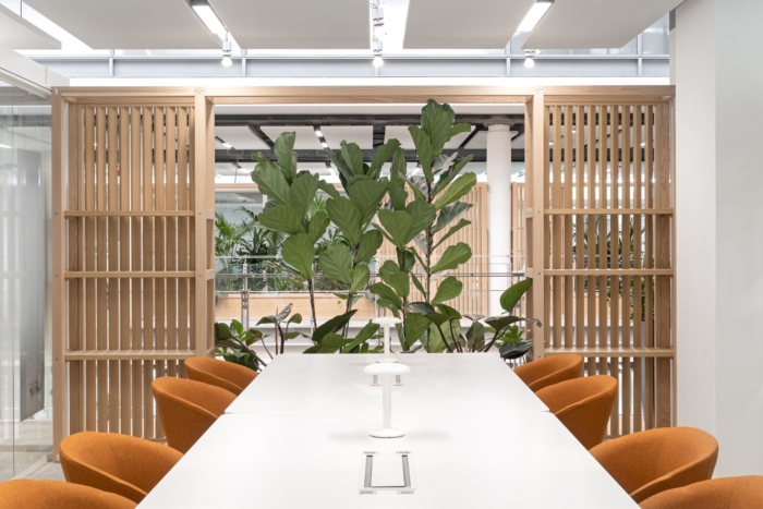 Save Wind Tre Offices - Milan View Project SPaRC powered by SPERI Giacomo Albo Acoustic Ceiling Panel, Chair, Column, Large Open Meeting Space, Plants, Wood