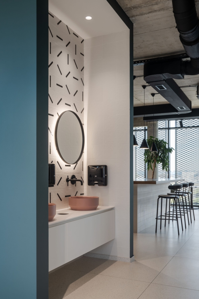 Save Drina Plastika Offices - Belgrade View Project ZABRISKIE Miloš Martinović Bar Stool, Cement, Counter, Exposed Duct, Plants, Restroom, Stone Tile