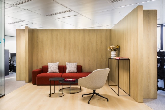Save Recordati Offices - Paris View Project Sowen Romain Ricard Breakout Space, Carpet, Counter, Drop Ceiling, Lounge Chair, Occasional Table, Sofas / Modular Lounge, Wood, Wood Floor