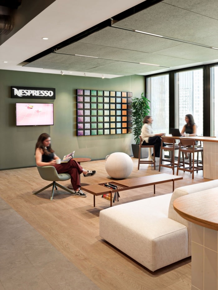 Save Nestle Orjin Plaza Offices - Istanbul View Project Studio 13 Architects Ibrahim Ozbunar Acoustic Ceiling Panel, Bar Stool, Branding, Chair, Coffee Table, High Table, Occasional Table, Ottoman / Pouf, People, Plants, Stone Tile, Wall Tile, Wall-Mounted Display, Wood, Wood Floor