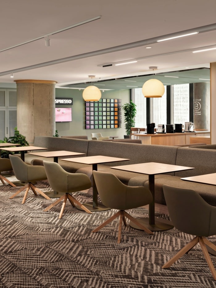 Save Nestle Orjin Plaza Offices - Istanbul View Project Studio 13 Architects Ibrahim Ozbunar Banquette Seating, Branding, Carpet, Cement, Chair, Column, Pantry Area / Coffee Point, Wall Graphics, Wall-Mounted Display, Wood, Work Lounge