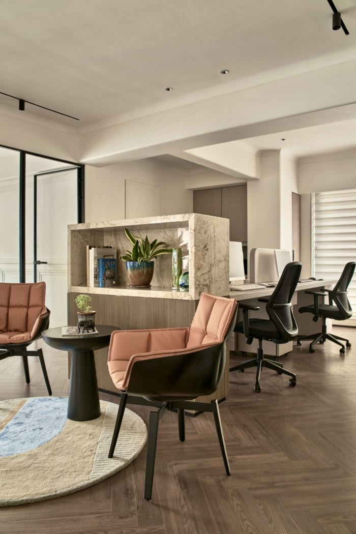 Save Elemental Offices - Mumbai View Project Iram Boxwala Design Studio The Endless Forms Breakout Space, Chair, Column, Glass Walls, Occasional Table, Open Office, Parquet Floor, Plants, Task Chair